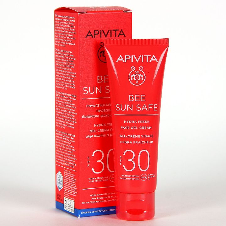 El gel crema Hydra Fresh de Apivita proporciona una protección de amplio espectro frente a la radiación UVA y UVB, gracias a una combinación fotoestable de filtros solares. Ofrece una hidratación instantánea y de larga duración, además de refrescar la piel con alga marina, aloe y ácido hialurónico. Previene el envejecimiento prematuro gracias al extracto de propóleo patentado.
