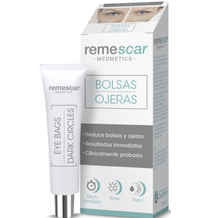 Remescar Bolsas y Ojeras es un tratamiento que reduce visiblemente la apariencia de bolsas y ojeras hasta en un 75%. Ofrece resultados inmediatos y es eficaz desde la primera aplicación, habiendo sido clínicamente probado. Su tecnología revolucionaria EYESYL actúa de forma inmediata sobre las bolsas y ojeras, gracias a una combinación de minerales de arcilla y un complejo de bi-péptidos que actúa a tres niveles: tensando la piel, disminuyendo el exceso de líquidos y reduciendo las contracciones musculares.