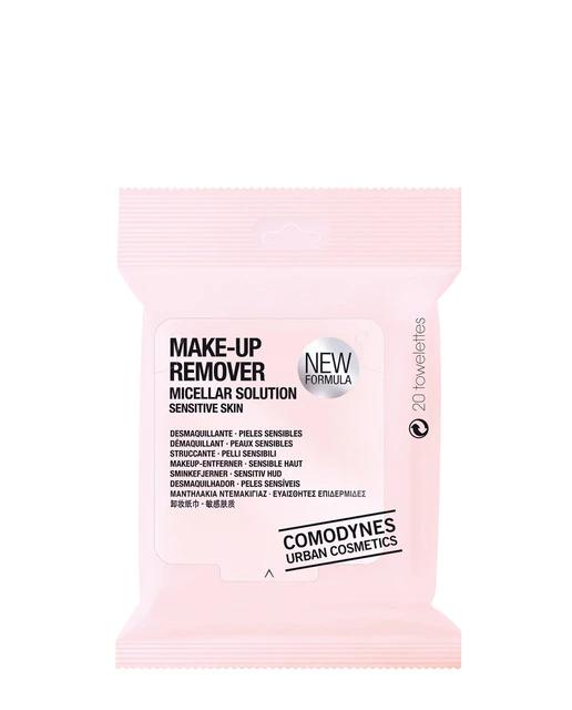 Las Toallitas Make-Up Remover Micellar Solution para piel sensible de Comodynes sustituyen a la leche, el tónico y el desmaquillador de ojos. Eliminan impurezas y maquillaje, dejando la piel suave, limpia, tonificada e hidratada. Presentadas en un formato de 20 toallitas, contienen activos principales como tensioactivos suaves, betaina, derivado de la glucosa y extractos vegetales.