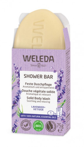 - Jabón de ducha sólido con fragancia de lavanda y vetiver.